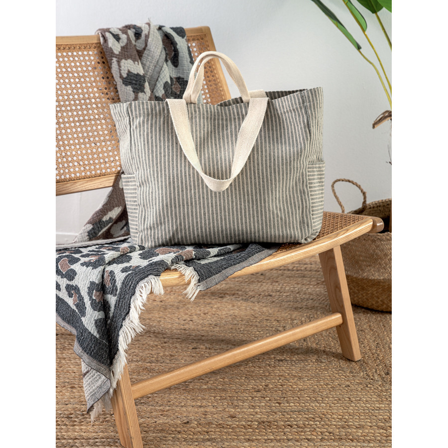 Ανακάλυψε μια πρακτική και κομψή τσάντα θαλάσσης με διαχρονικό ριγέ σχέδιο, ιδανική για τις καλοκαιρινές σου εξορμήσεις. Κατασκευασμένη από ανθεκτικό ύφασμα και με άνετα χερούλια, προσφέρει ευκολία στη μεταφορά και αρκετό χώρο για όλα τα απαραίτητα της παραλίας.