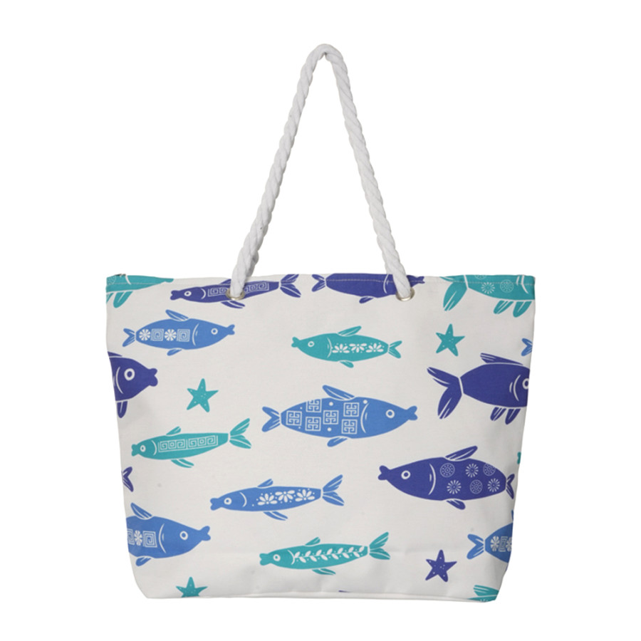 Μια χαρούμενη και καλοκαιρινή τσάντα θαλάσσης με παιχνιδιάρικο σχέδιο ψαριών σε αποχρώσεις του μπλε και του τυρκουάζ. Η θαλασσινή της αισθητική την καθιστά ιδανική επιλογή για την παραλία, προσθέτοντας μια φρέσκια και ξεχωριστή πινελιά σε κάθε εμφάνιση.