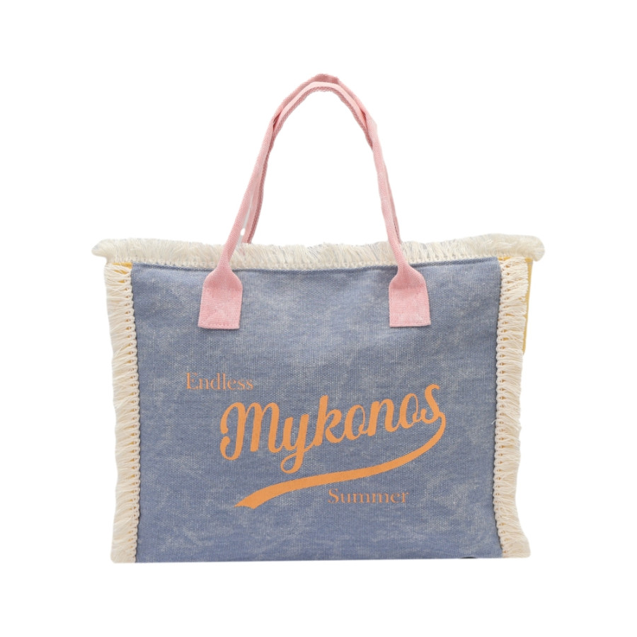 Ανακάλυψε μια ξεχωριστή τσάντα θαλάσσης με καλοκαιρινό χαρακτήρα και μοντέρνο design, διακοσμημένη με εντυπωσιακή στάμπα “Mykonos” που αποπνέει νησιώτικη διάθεση. Με ανθεκτικό ύφασμα, άνετα χερούλια και διακοσμητικά κρόσσια, συνδυάζει πρακτικότητα και στυλ, αποτελώντας ιδανική επιλογή για την παραλία και τις καλοκαιρινές σου βόλτες.